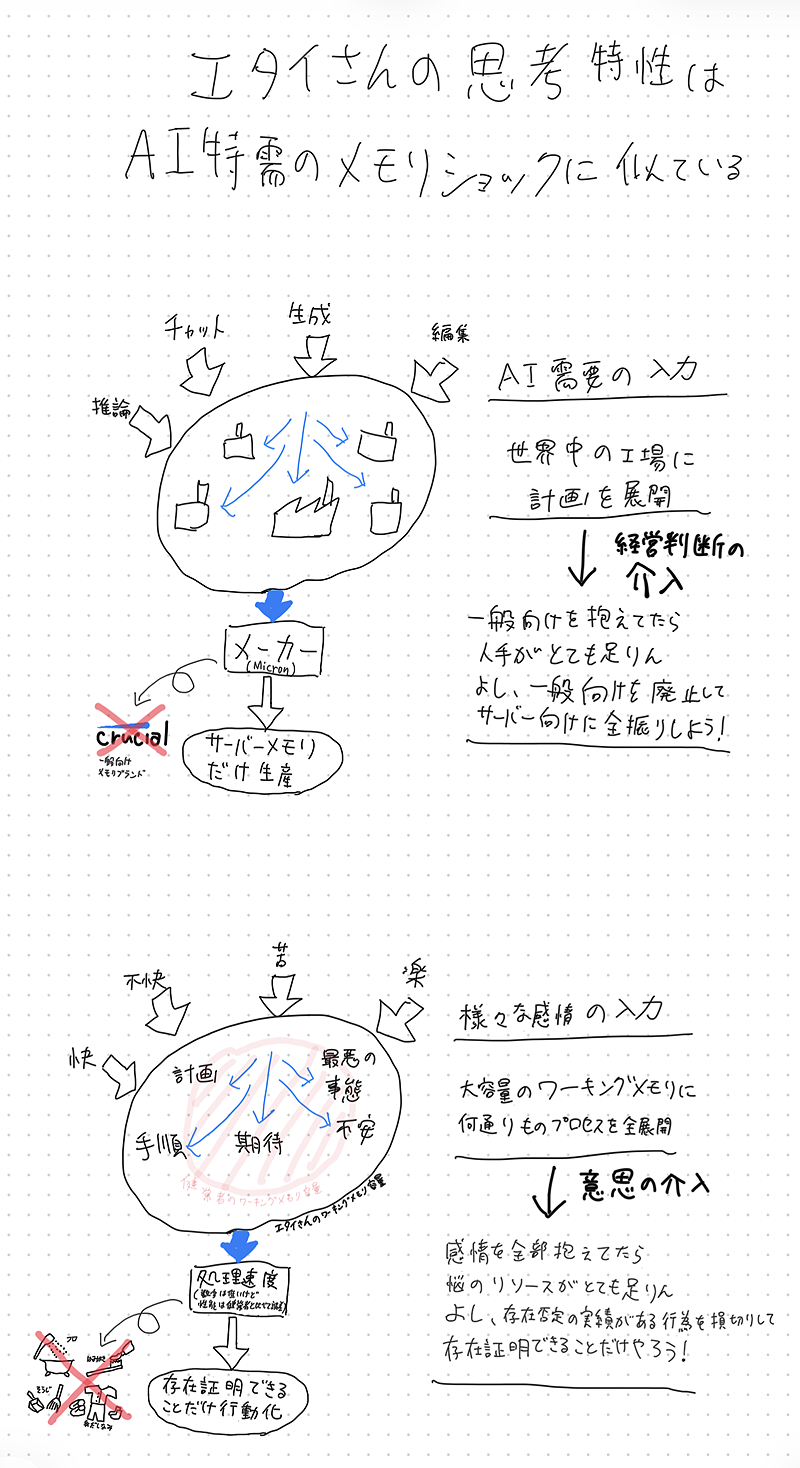 2025年11月ごろからメモリの高騰が続いているが、この異常事態は私の思考特性と似ている。AI特需でサーバー増強のため大量のメモリが必要になったが、大手のMicronはこの需要に応えるべくサーバー向けメモリの生産に全振りするため、一般向けメモリブランドのCrucialを廃止することを発表した。いかに大手とはいえ人手は限られているので一般向けには手がつけられなくなり損切りしたわけだが、これと同じことが私の頭の中で起きているのである。